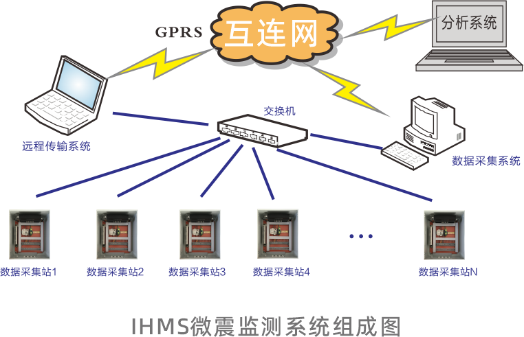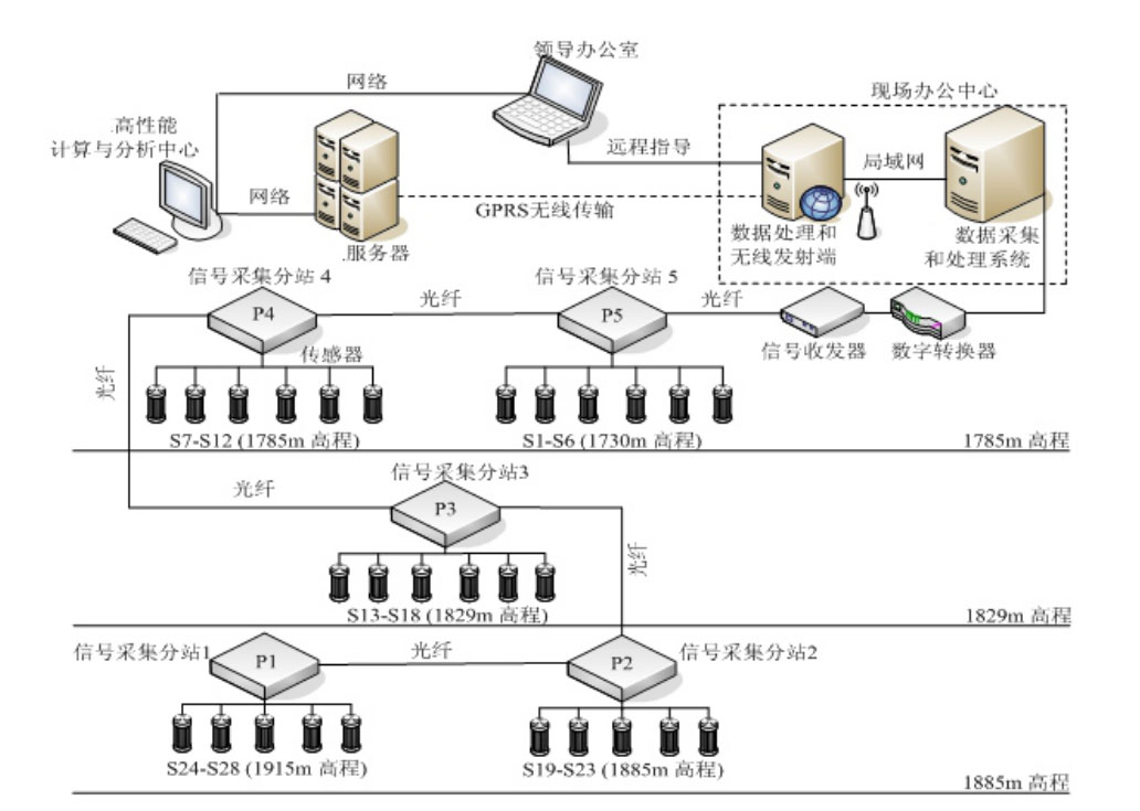 系統(tǒng)主要由監(jiān)測傳感器、數(shù)據(jù)采集站、傳輸光纜 網(wǎng)線、GPS授時(shí)同步模塊、數(shù)據(jù)綜合處理主機(jī)(含微震數(shù)據(jù)實(shí)時(shí)采集)、無線數(shù)據(jù)傳輸系統(tǒng)、短信報(bào)警系統(tǒng)、事件定位與數(shù)據(jù)分析軟件等組成。具有低功耗、高采樣率、高信噪比、方便易用等特點(diǎn)。由于采用分布式設(shè)計(jì),多個(gè)微震數(shù)據(jù)采集站可通過光纖級(jí)聯(lián),最大可拓展至2048個(gè)數(shù)據(jù)采集通道,最大監(jiān)測范圍達(dá)80KM??赏ㄟ^無線模塊回傳數(shù)據(jù)、遠(yuǎn)程管理設(shè)備,支持手機(jī)短信故障報(bào)警,數(shù)據(jù)綜合處理分析中心完成微震動(dòng)事件的時(shí)空定位和其他分析處理。
