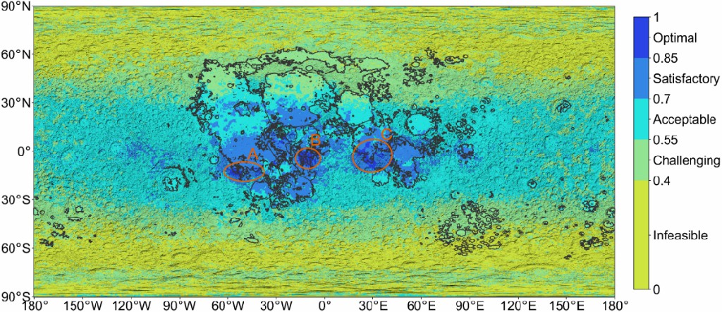 圖2 月球基地選址全月適宜性分布圖。A、B、C區(qū)域是工程地質(zhì)適宜性最高的區(qū)域,A:風暴洋(Oceanus Procellarum)南端;B:島海(Mare Insularum)南部;C:靜海(Mare Tranquillitatis)南部